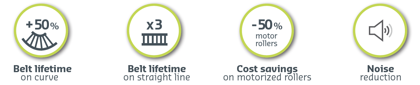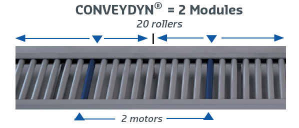 - With CONVEYDYN® = only 1 motor for up to 20 slave rollers for same performances.